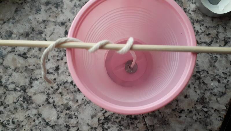 Hang de katoenen touw nu in je vorm (Ik heb twee bekertjes gebruikt). De bovenkant draai je een paar keer om een saté prikker. En leg deze op het bekertje. Zorg er voor dat het uiteinde niet in het bekertje hangt en dat je lont ongeveer recht in het midden hangt.