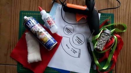 Benodigdheden: papier, dun karton, vilt, klemmetje, lijmspray, alles lijm, lijmpistool, schaar, linten en andere decoratie.