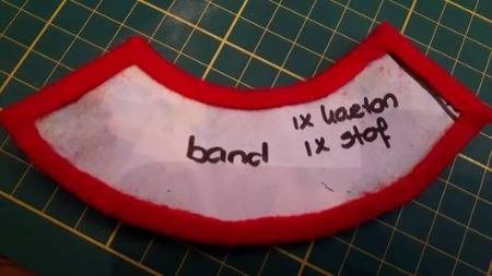 Ik neem de hoedrand even als voorbeeld, omdat ik daar altijd mee begin. Je lijmt (lijmspray) het met karton beplakte patroon op het stuk stof. Dit knip je ruim uit (ongeveer een 0,5 cm). Spuit de randen in met spray en vouw deze om. Het ziet er dan zo uit.
